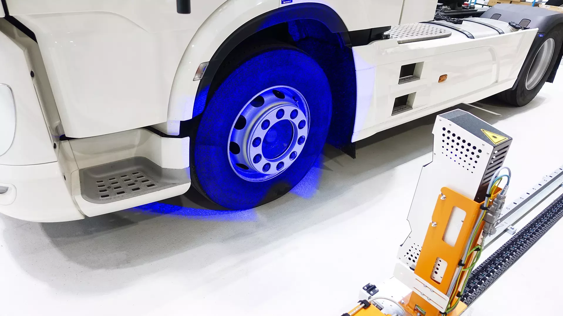 The two cameras of this non-contact system capture the entire wheel and display it as a three-dimensional “measuring surface in space.” This measuring surface helps to calculate chassis geometry values such as toe-in and camber. The innovative sensor x-3Dsurface also enables non-contact caster and kingpin inclination measurement for the first time without having to mount measuring plates on the wheel. Precise adjustment of the chassis geometry ensures that the steering wheel remains straight while the vehicle is driving straight ahead, and tire wear is optimized, ensuring increased range on commercial vehicles with either a combustion engine or electric motor.
