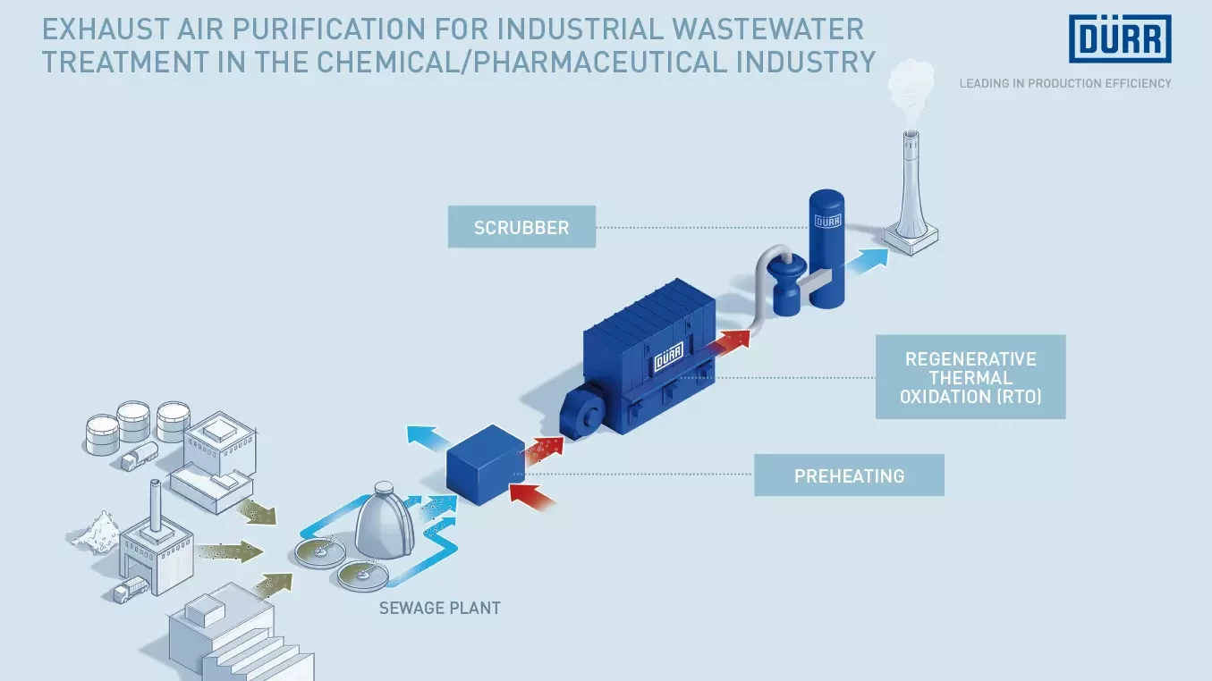 Bietigheim-Bissingen, September 25th, 2018 – Bad odors are a frequent problem in waste water purification plants. This is especially true for waste water from chemical and pharmaceutical production, which generates both an intensely smelling and corrosive exhaust air. In order to avoid unpleasant odors, ARA Rhein AG, the operator of one of the largest industrial purification plants in Switzerland, uses an Ecopure® RTO air pollution control system from Dürr. The multi-stage system with upstream exhaust air conditioning and downstream flue gas scrubbing reliably protects the region from unpleasant odors.