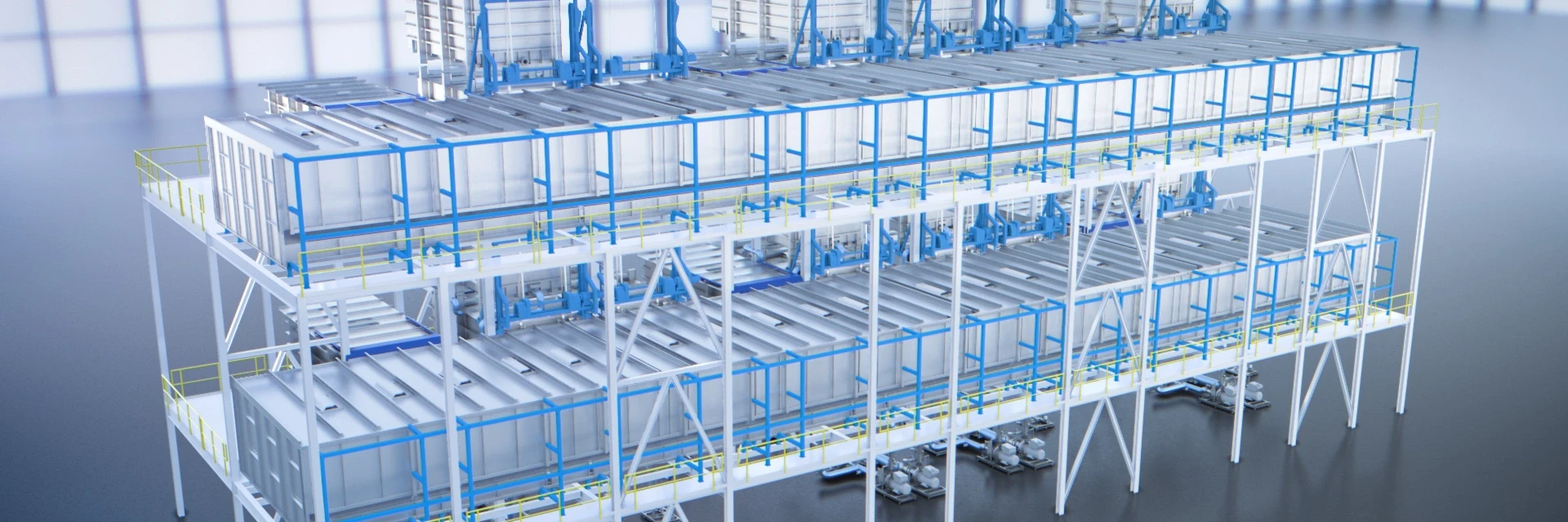 Anziché utilizzare grandi serbatoi, l'innovativo design del sistema di Dürr prevede camere compatte, che vengono riempite o progettate come camere di spruzzatura a seconda della fase di processo. A livello di processo, la carrozzeria viene caricata attraverso una porta a tapparella nel tunnel sui carri di trasferimento trasversale, che la portano alle rispettive camere di processo. Per i futuri sistemi di serie, sono previsti fino a cinque di questi carri di trasferimento trasversale, che lavorano in sezioni precedentemente definite e portano le carrozzerie alle camere.